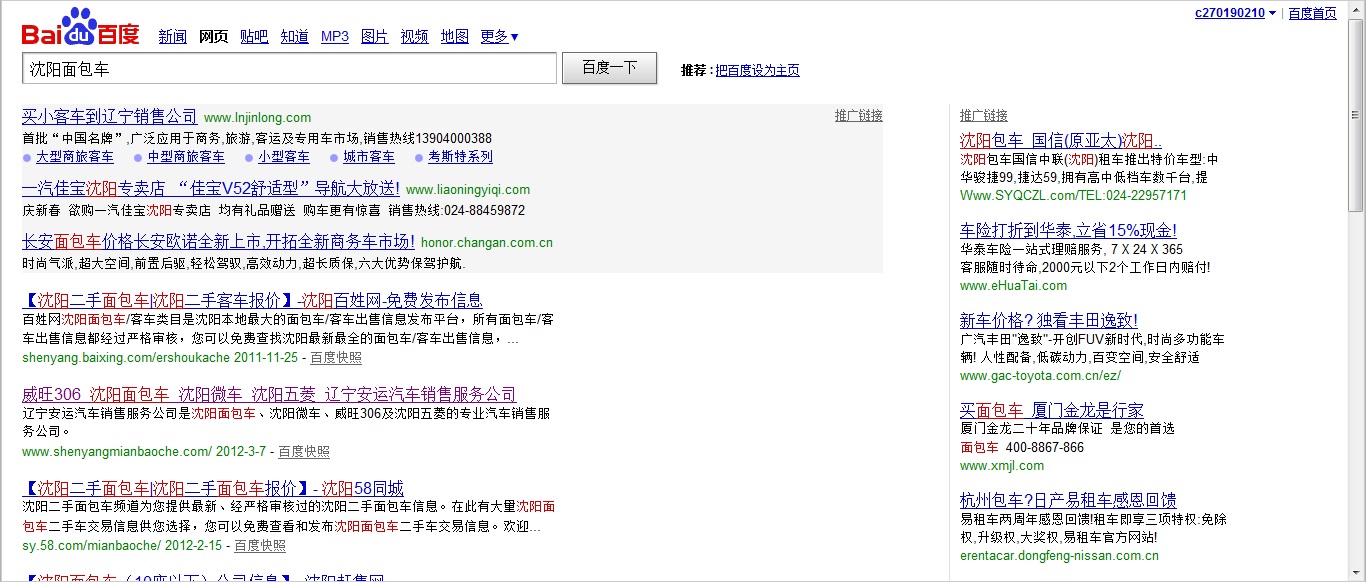 關鍵詞選擇:沈陽面包車 優化效果:百度排名第一頁