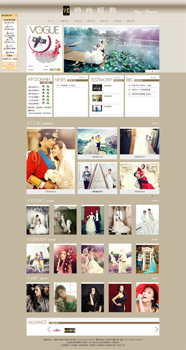時尚經典網站風格為歐美風格,主色調為卡其色,以展示婚紗照作品為主。后臺采用ASP.NET2.0技術開發網站系統。為滿足網站的大量信息數據要求,數據庫采用oracle版本數據庫存儲數據。服務器采用windows2003server操作系統。網站信息采用后臺自動生成靜態頁技術,靜態信息網頁可以節省大量服務器資源,免去頻繁調用數據庫,可以提高網站的瀏覽速度、而且靜態頁對搜索引擎也比較友好,容易后期搜索引擎優化。網站頁面采用DIV+CSS布局,div+css布局技術是目前主流的一種網頁布局方式,頁面簡介,瀏覽迅速,利于搜索引擎優化,兼容性也很強。