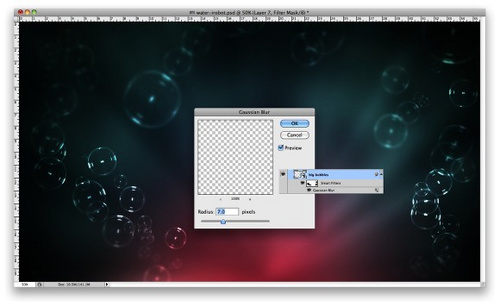 圖09 步驟10 選擇泡沫層,去濾鏡>轉(zhuǎn)換為智能濾鏡,然后去濾鏡>模糊>高斯模糊。使用7像素的半徑。整個圖層會很模糊,圖層面板上白色的略縮圖就是所謂的智能濾鏡。選擇畫筆工具(B),使用黑色描繪你不希望泡沫模糊的地方。這就像是一個智能濾鏡的蒙板。