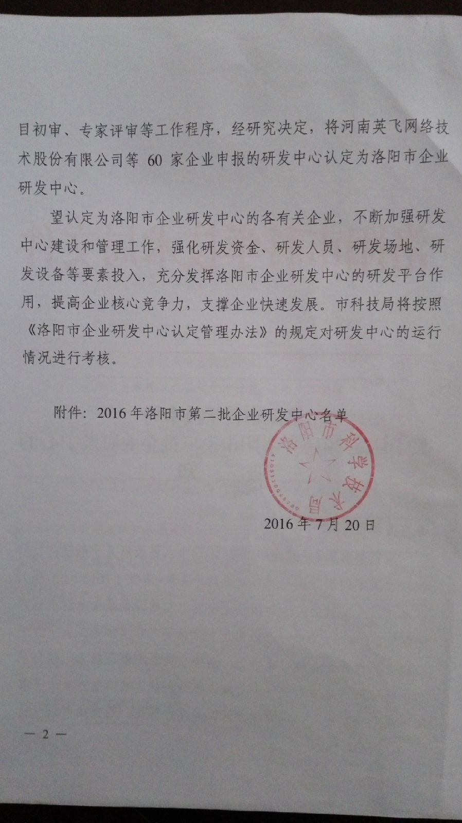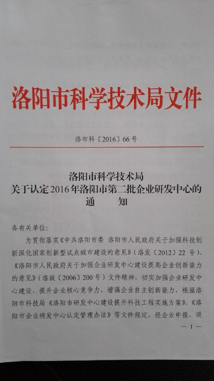 2016年8月, 公司設(shè)立的“洛陽(yáng)市有機(jī)廢氣治理溶劑回收再利用企業(yè)研發(fā)中心”獲得洛陽(yáng)市科技局認(rèn)定。(《洛陽(yáng)市科技局關(guān)于認(rèn)定2016年洛陽(yáng)市第二批企業(yè)研發(fā)中心的通知》洛市科【2016】66號(hào)文件)